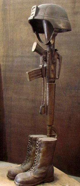 Lori Betz created and donated this bronze sculpture, Battle Cross, to the Helping a Hero National Gala. Helping a Hero is a non-profit organization that fosters support for military personnel that have been wounded in service. The Gala was a spectacular fundraising event that raised over $3 million to build specially-adapted homes for wounded soldiers.